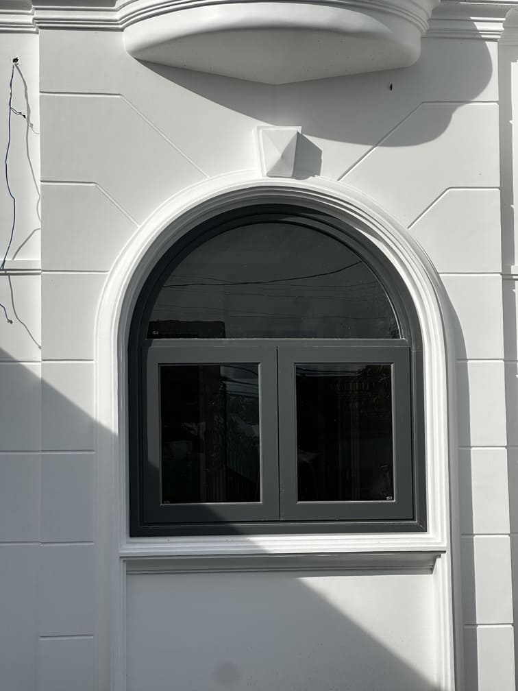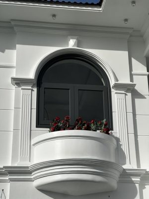Mặt tiền nổi bật với tông màu trắng – nâu ấm, điểm xuyết những chi tiết đá tự nhiên và conwood bền đẹp theo thời gian, tạo cảm giác sang trọng nhưng không xa cách.